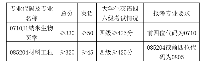 (2)对符合纳米生物医学(0710J1)调剂条件的考生按照英语成绩排序遴选,英语成绩相同时参考初试总成绩排序遴选,在两者皆相同时参考大学生英语四六级成绩排序遴选。