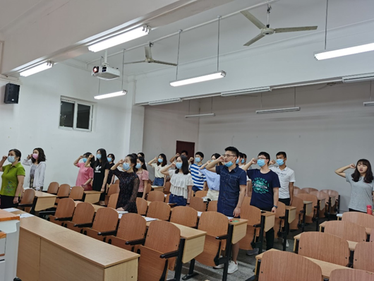 仪式第一项,讲述战役故事。 全体党员积极发言,结合亲身经历,讲述身边战役故事,立足岗位谈切身体会,感悟共产党员的初心,牢记使命和责任。杜雪讲述自己外公值班做志愿者的故事,在耄耋之年仍能心系党和人民;喻苗谈自己做学院志愿者的真实体会,勇于担当;向莉讲述自己本科同学虽不愿离开已患癌症的妻子,但仍加入前线战役,舍小家为大家;佘欣未在疫情期间为他人讲解口罩所用关键材料熔喷布的机理作用,发挥自己的专业知识等等。
