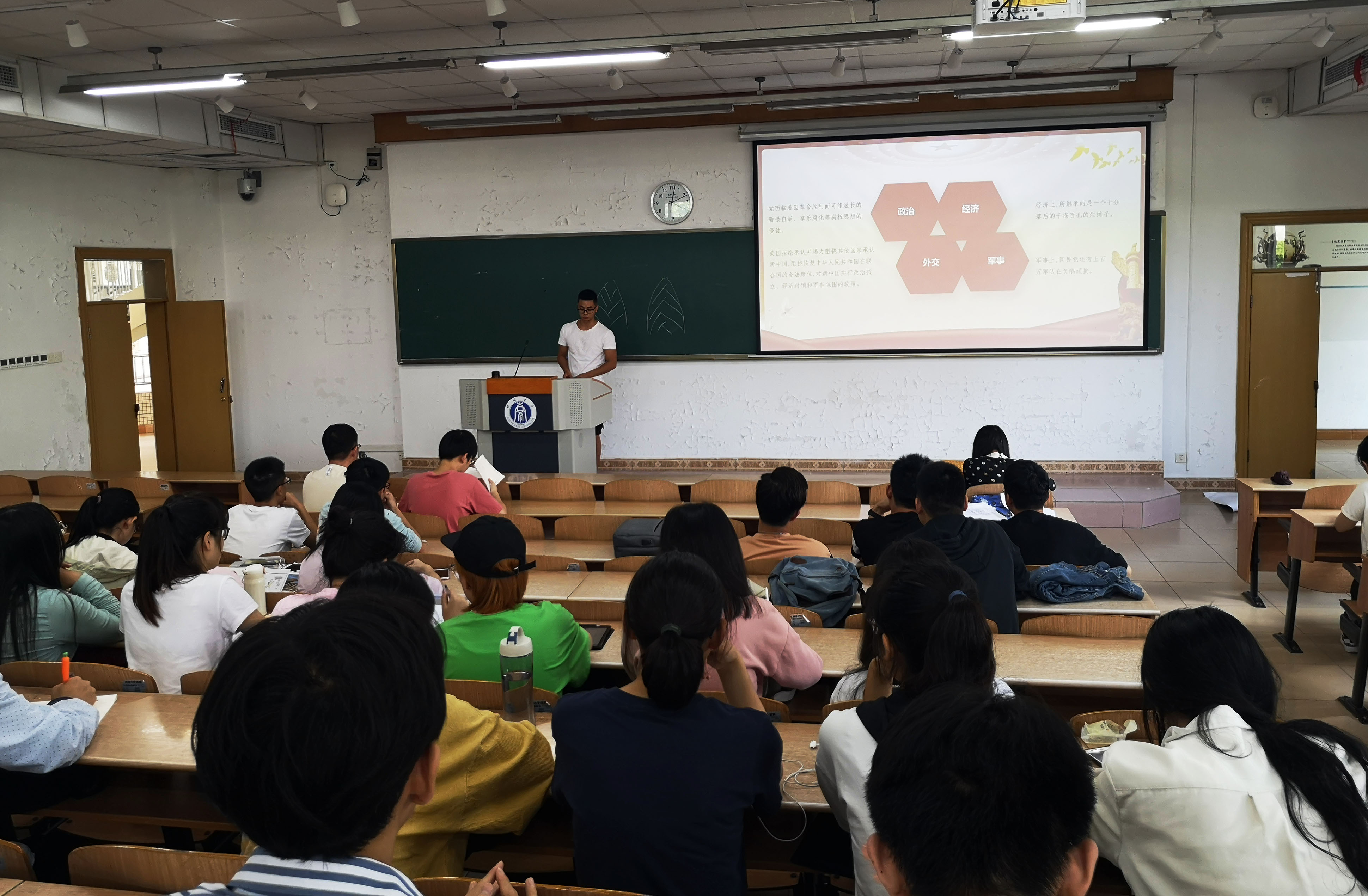 会上,张林同志带领大家学习回顾了我国建国以来取得的成就以及遇到的问题。他回顾了我国在建立初期遇到的困难,内忧外困,党和国家的事业立足未稳。经过几十年的奋斗,在党的带领下,国家终于走上了正途,党的事业立足了脚跟。在讲述过程中,他结合一些经典的影视作品,深入浅出地讲述了新中国的沧桑变革。