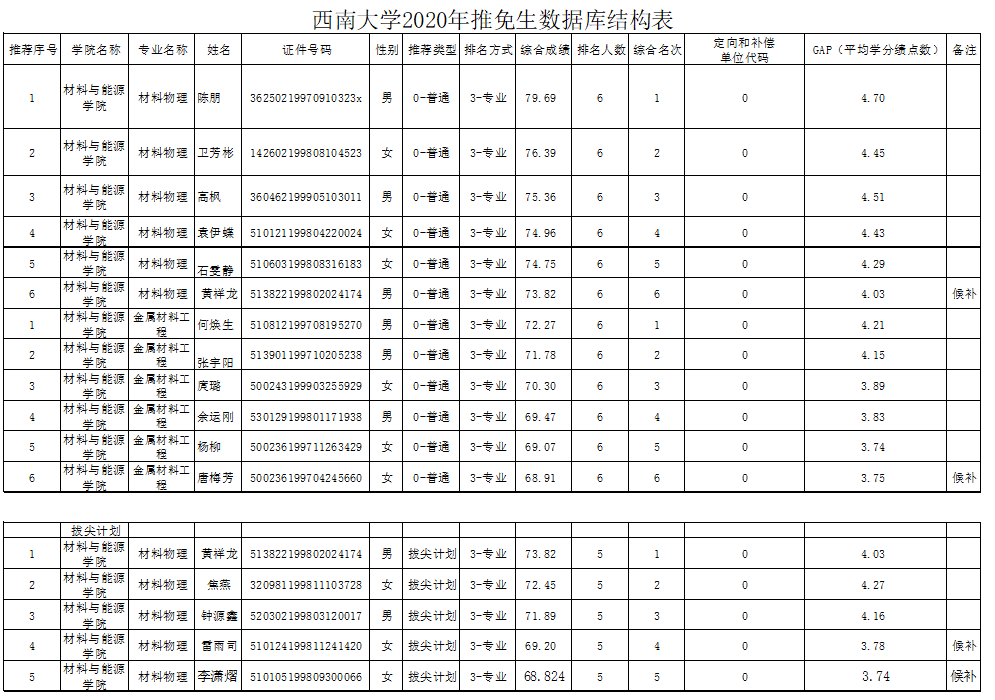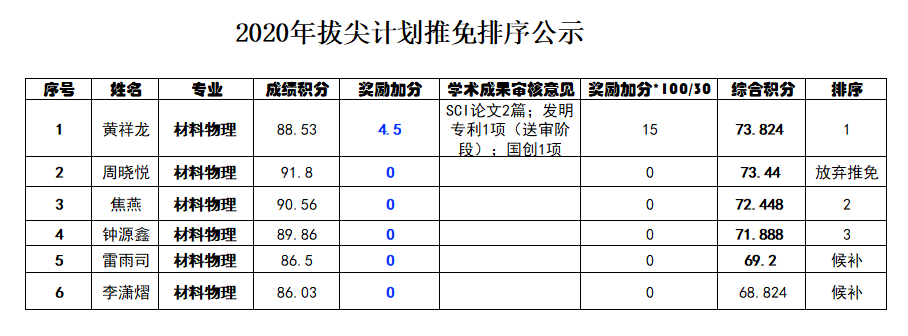 2020年推荐优秀应届本科毕业生免试攻读硕士研究生工作经本学院2016级学生自愿申请,学院本年级考评组对申请者的学习成绩和申请材料进行初步审核,对其学习和思想品德进行评议,学院专家组对申请人的科研成果及获奖进行审核认定、答辩评议,推免考评工作组对学生成绩积分进行计算审核,推免工作领导小组按照文件对申请人成绩积分、奖励积分进行了统计排序,现将推免结果公示如下: