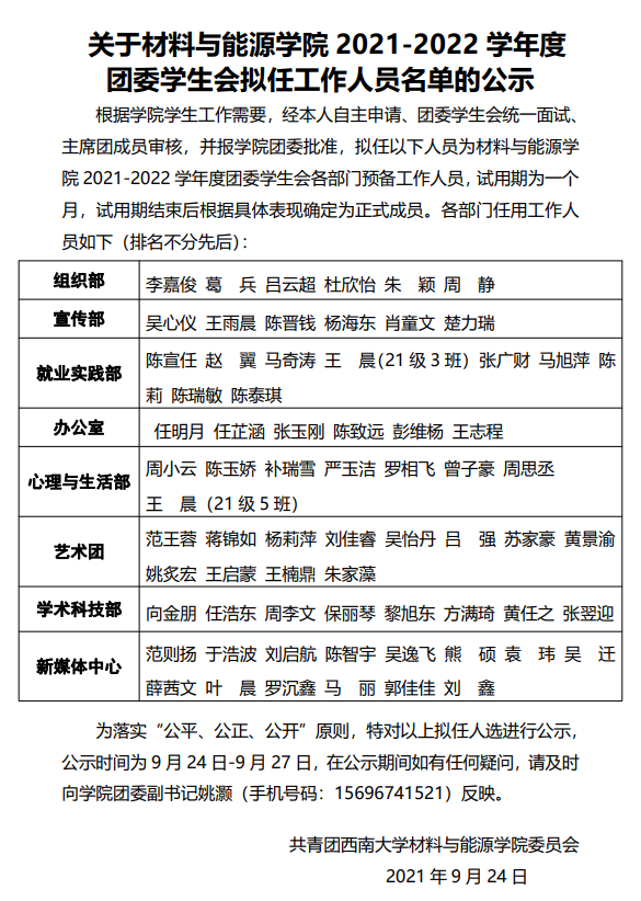 伟德betvlctor1946源于英国2021-2022学年度团委学生会拟任工作人员名单的公示